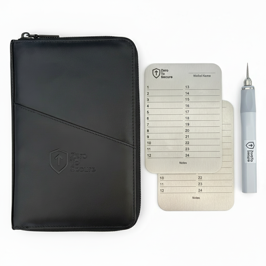 The Zero To Secure™ Kit turns that fragile slip of paper into a lifetime backup — engraved in stainless steel, immune to fire, water, and decay. No apps. No servers. No middlemen. Just offline protection that lasts as long as your wealth does.